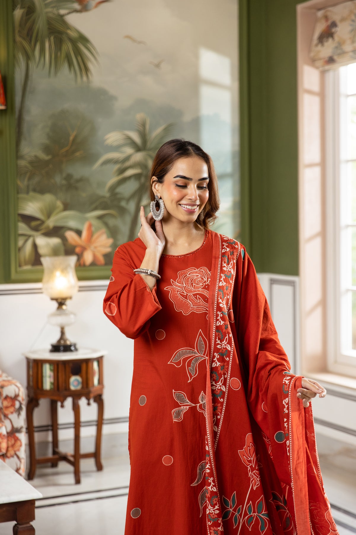 Nehamta Women's Rust Cotton Kurta with Palazzo & Dupatta