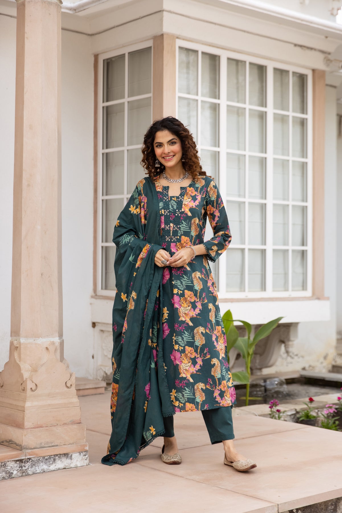 Nehamta Women's Green Cotton Kurta with Pant & Dupatta