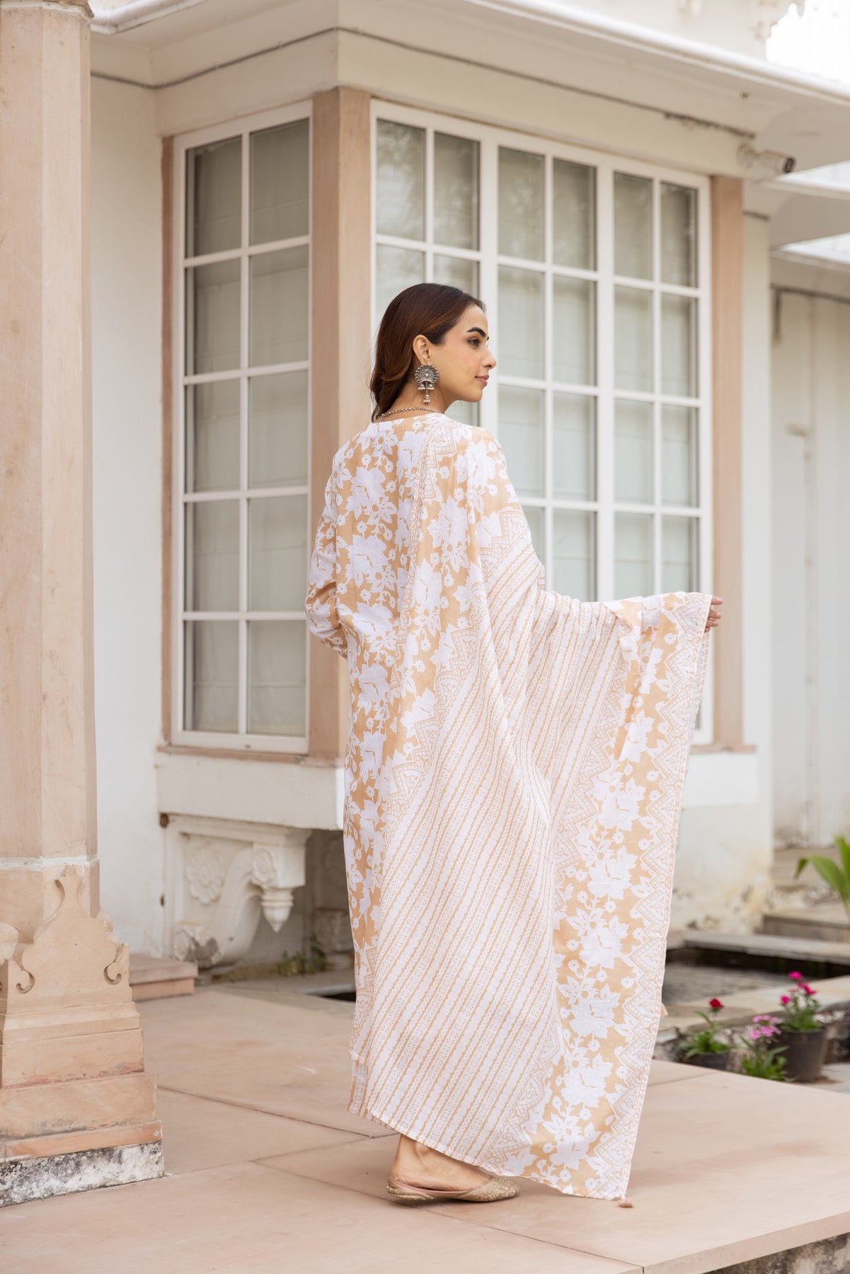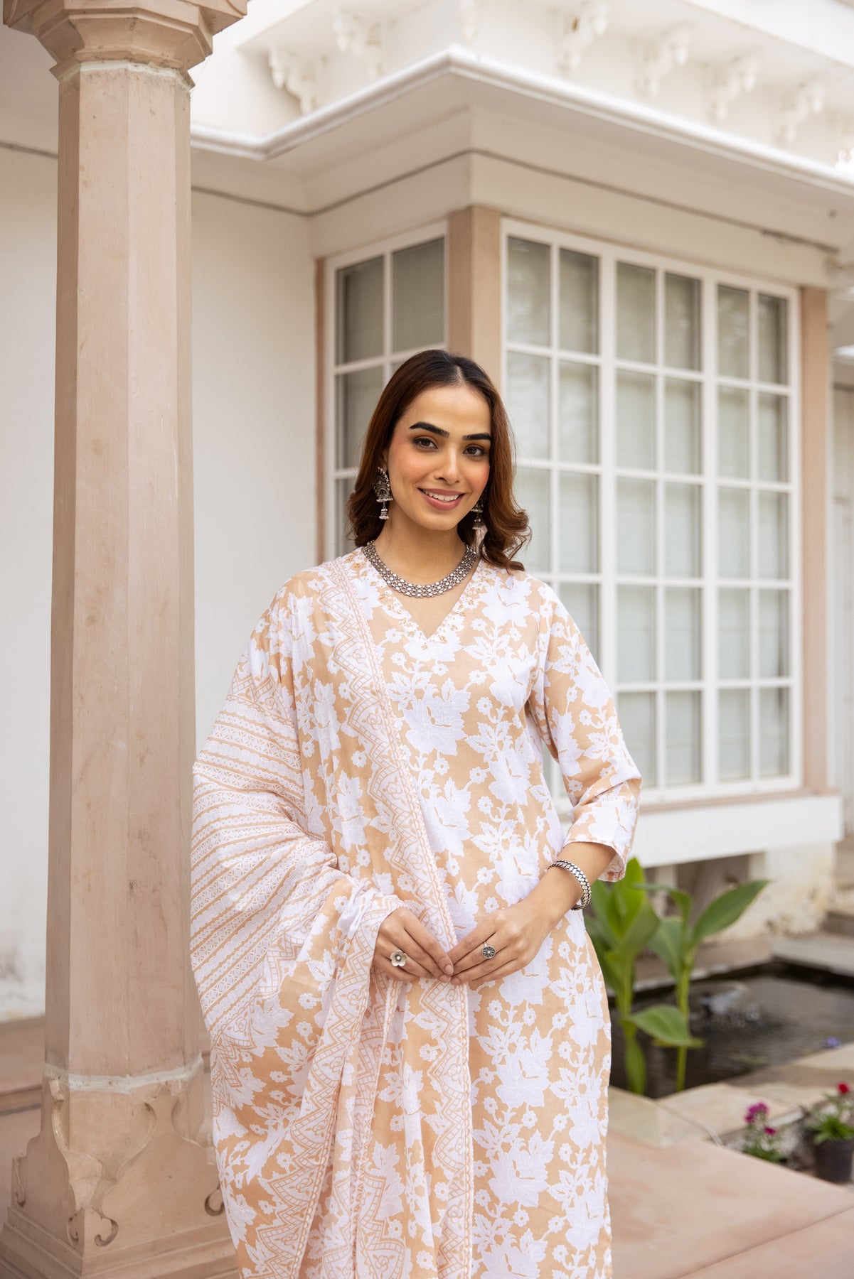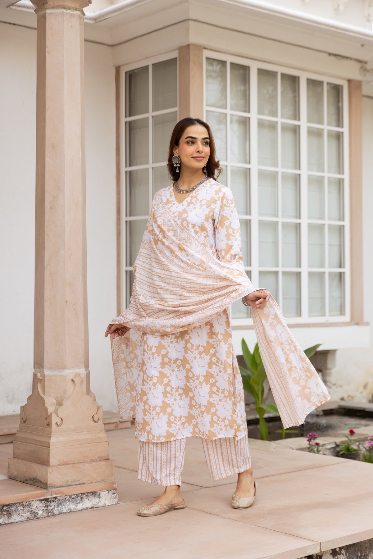 Nehamta Women's Beige:White Cotton Kurta with Trouser & Dupatta
