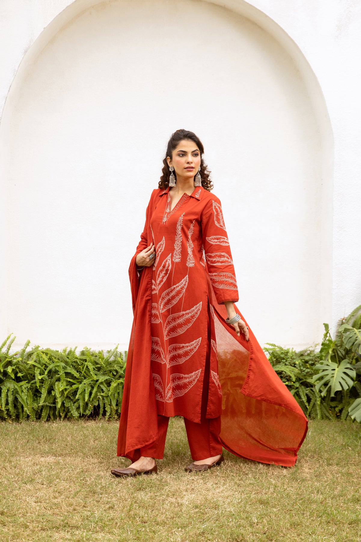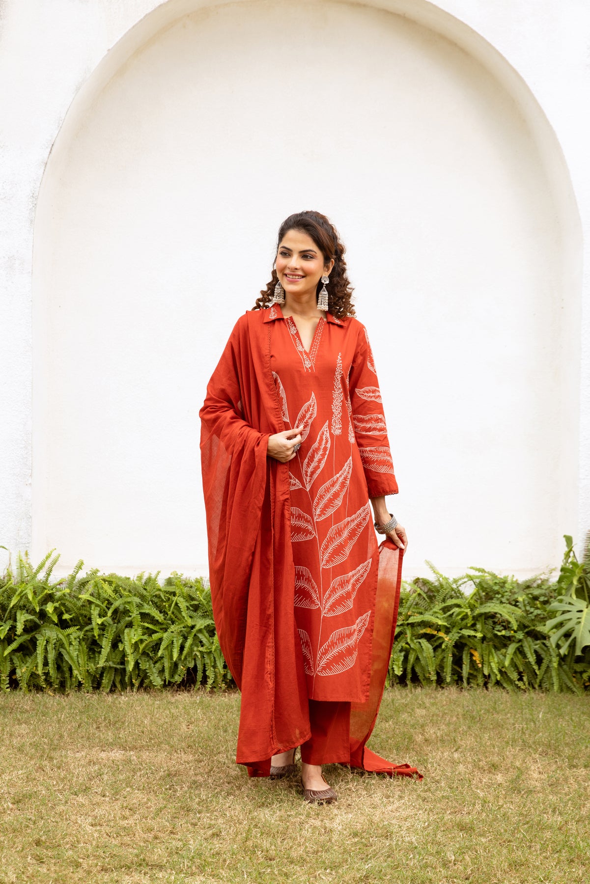 Nehamta Women's Rust Cotton Kurta with Pant & Dupatta