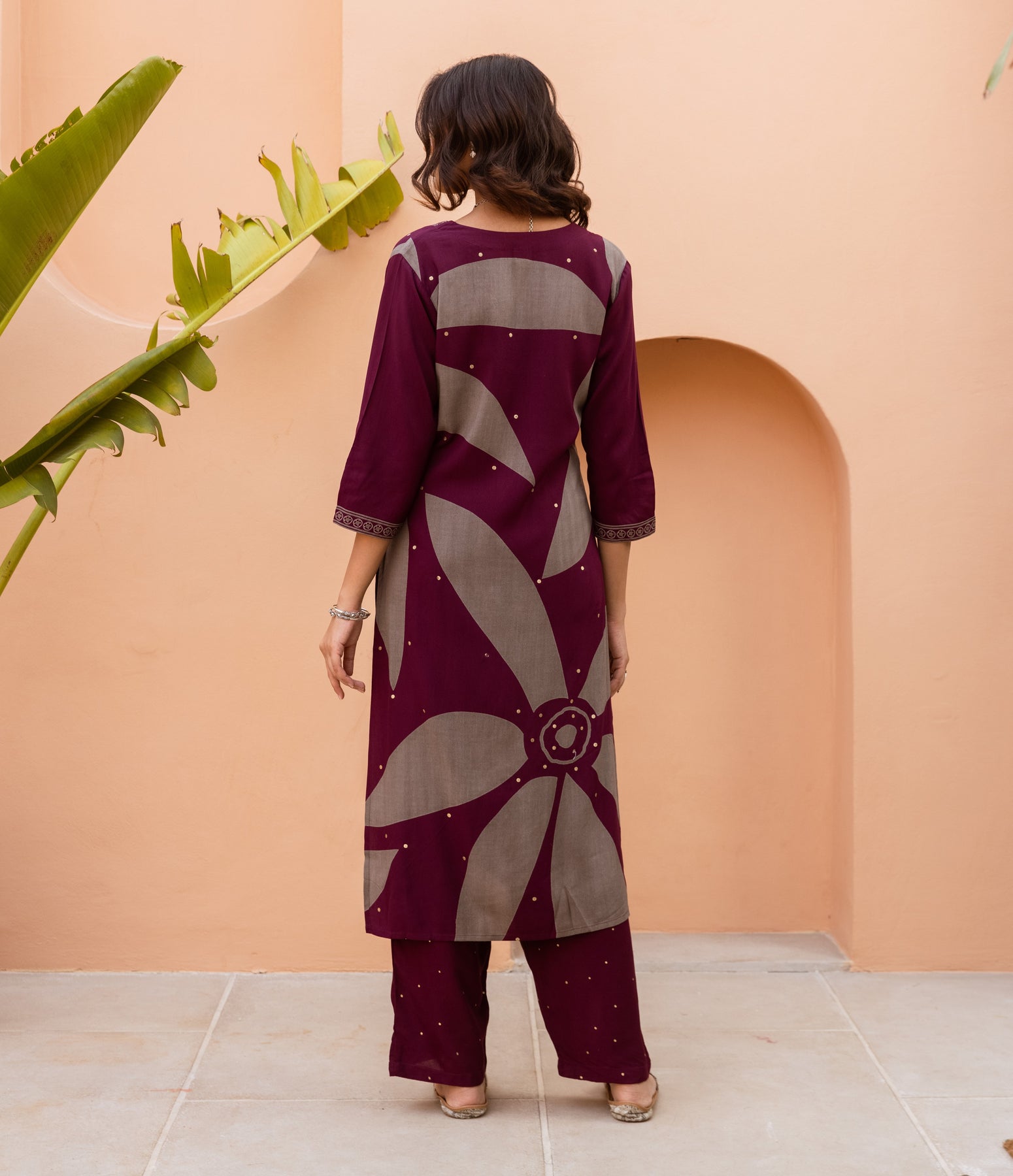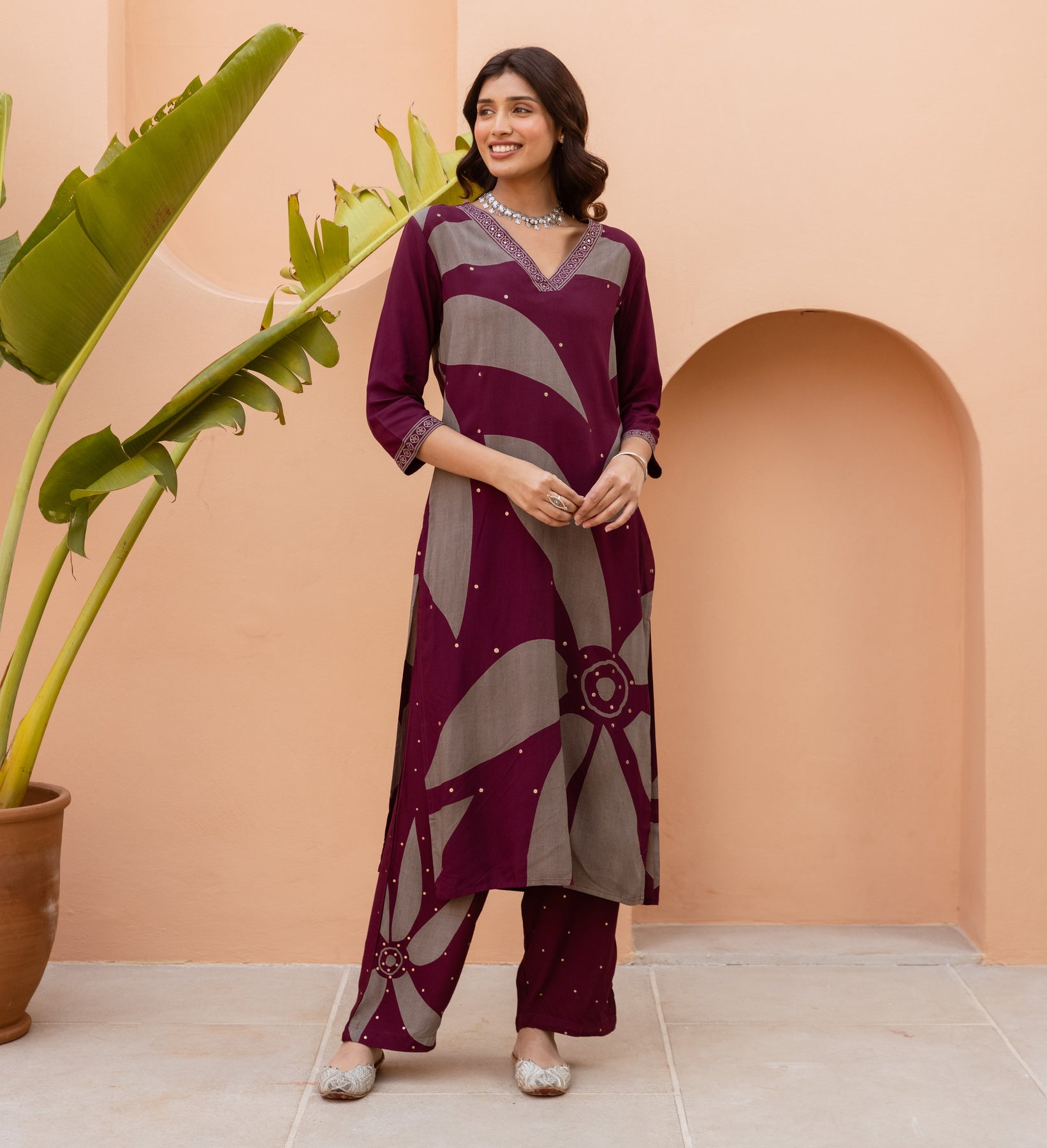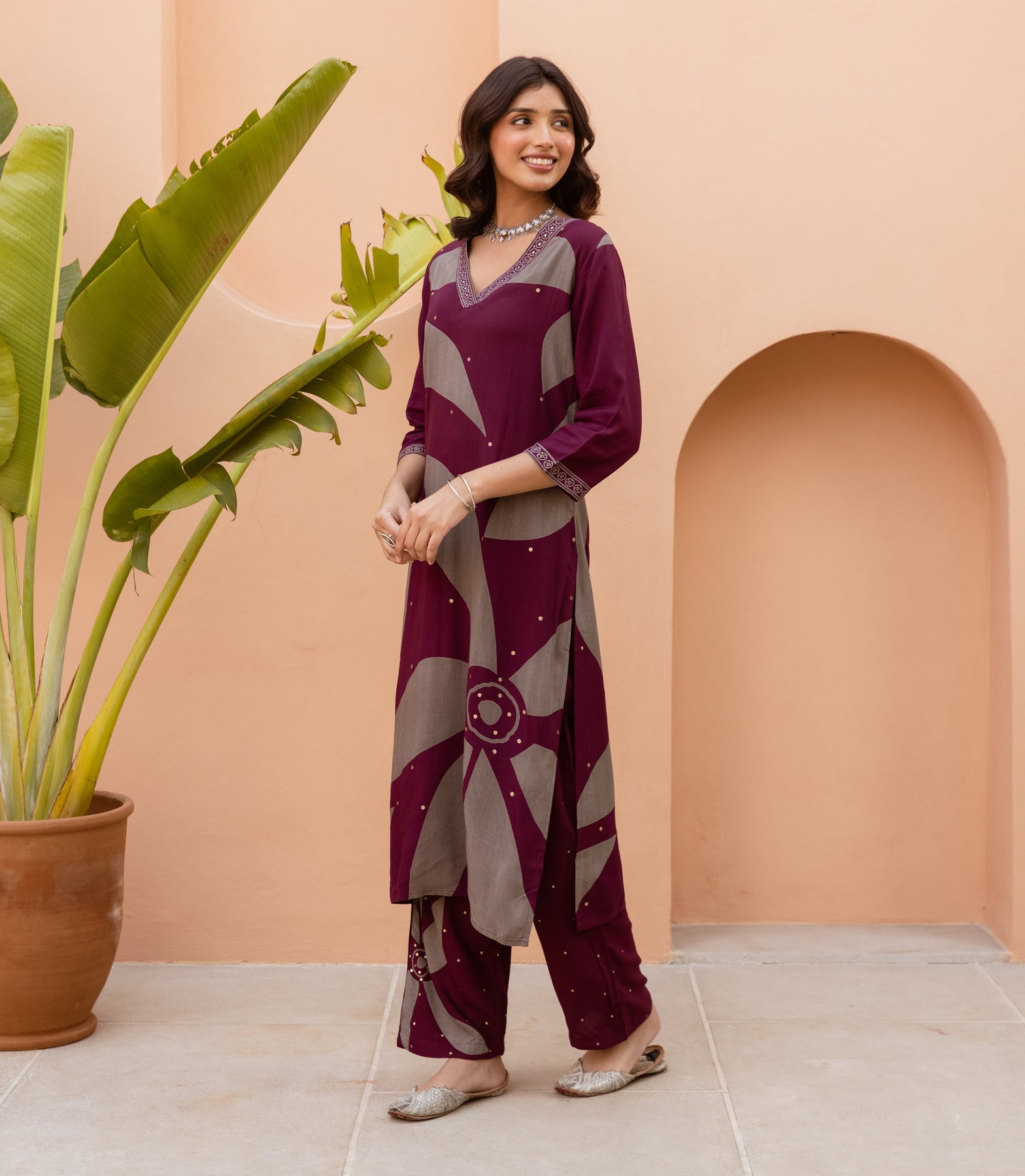 This Maroon Kurta & Palazzo set is crafted from soft German Rayon, offering both comfort and a stylish ethnic appeal. The kurta features intricate beads, sequins, and mirror work over a floral print, with 3/4 sleeves and a flattering V-neck for an elegant touch. It comes with a matching palazzo to complete the ensemble. Perfect for festive occasions, casual outings, or family gatherings with grace and charm.
