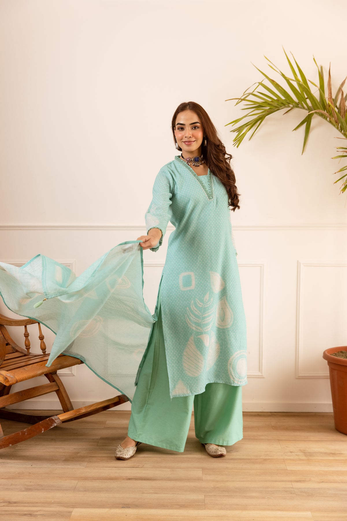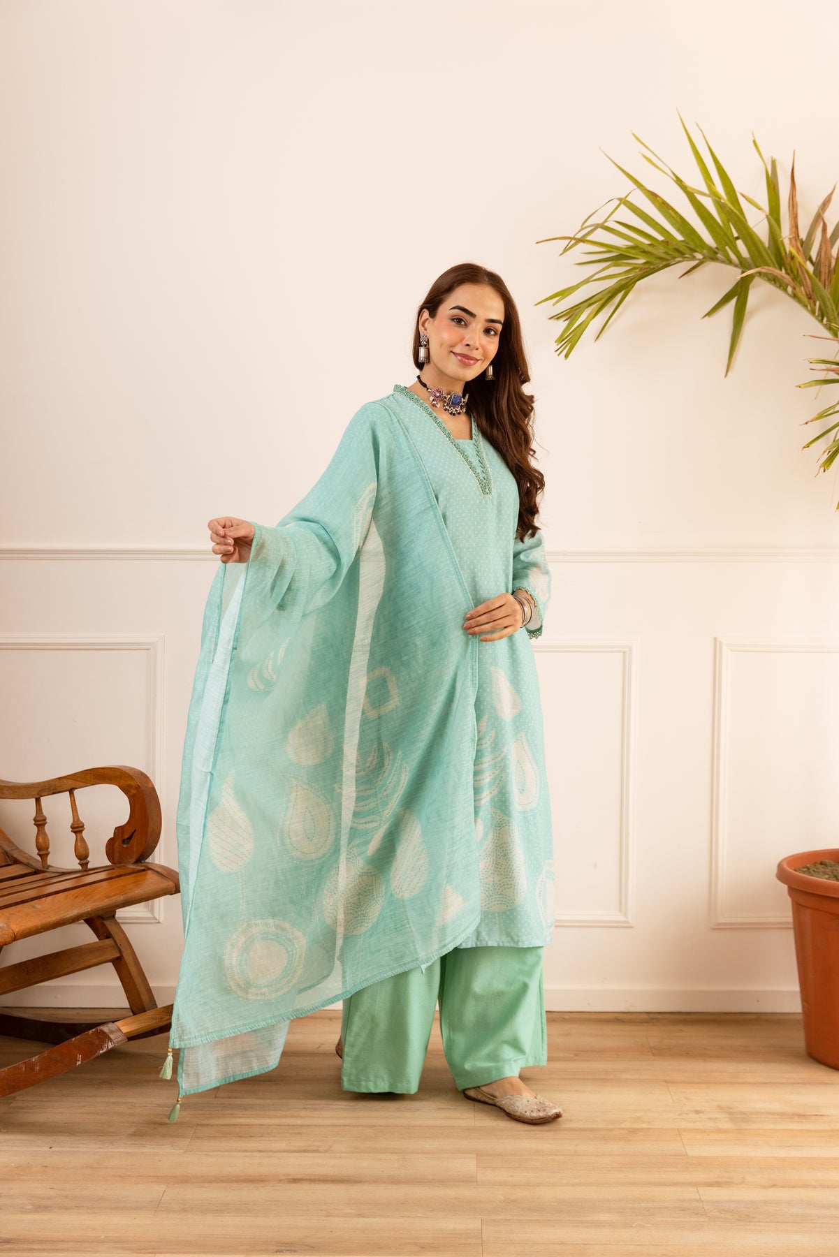 Nehamta Women's Mint Green Natural Linen Kurta With Palazzo & Dupatta set