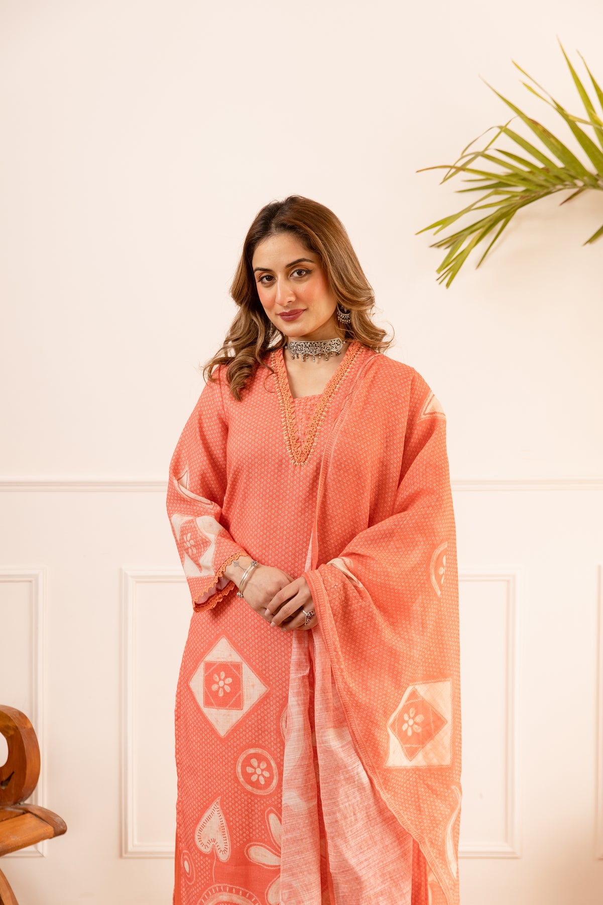 Nehamta Women's Orange Natural Linen Kurta With Palazzo & Dupatta set
