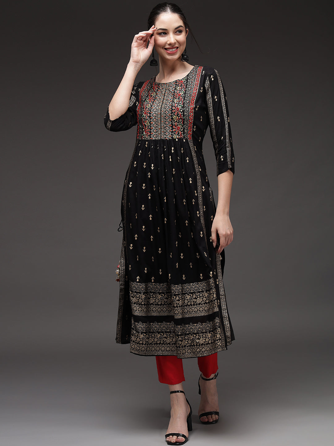 Glam up your beautiful look with this eye-catching A-line kurta with side slits. This black-colored flared kurta is made up of rayon Slub fabric, giving you an awesome look. This flared kurta has a tiny foil print featuring kantha, knots, Dabka, sequins, and, beads work along with fancy tassels on the sides. Suit it up with a pair of leggings along with stilettos or traditional jutties, a perfect choice for any casual or festive occasion.