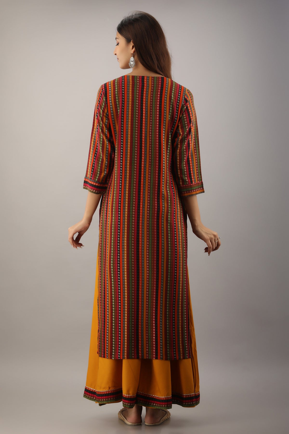 Embrace your ethnic look with this pretty straight kurta and palazzo set. This multicolored kurta paired with a yellow flared divider palazzo is made up of rayon fabric, giving you an ethnic look. The straight kurta has a geometric stripes print embellished with Zari work and Gota Patti work along with designer buttons. Flared divider palazzo has a decorative lace border on the hem. Suit it up with a heels or traditional jutties, an excellent choice for any festive occasion.