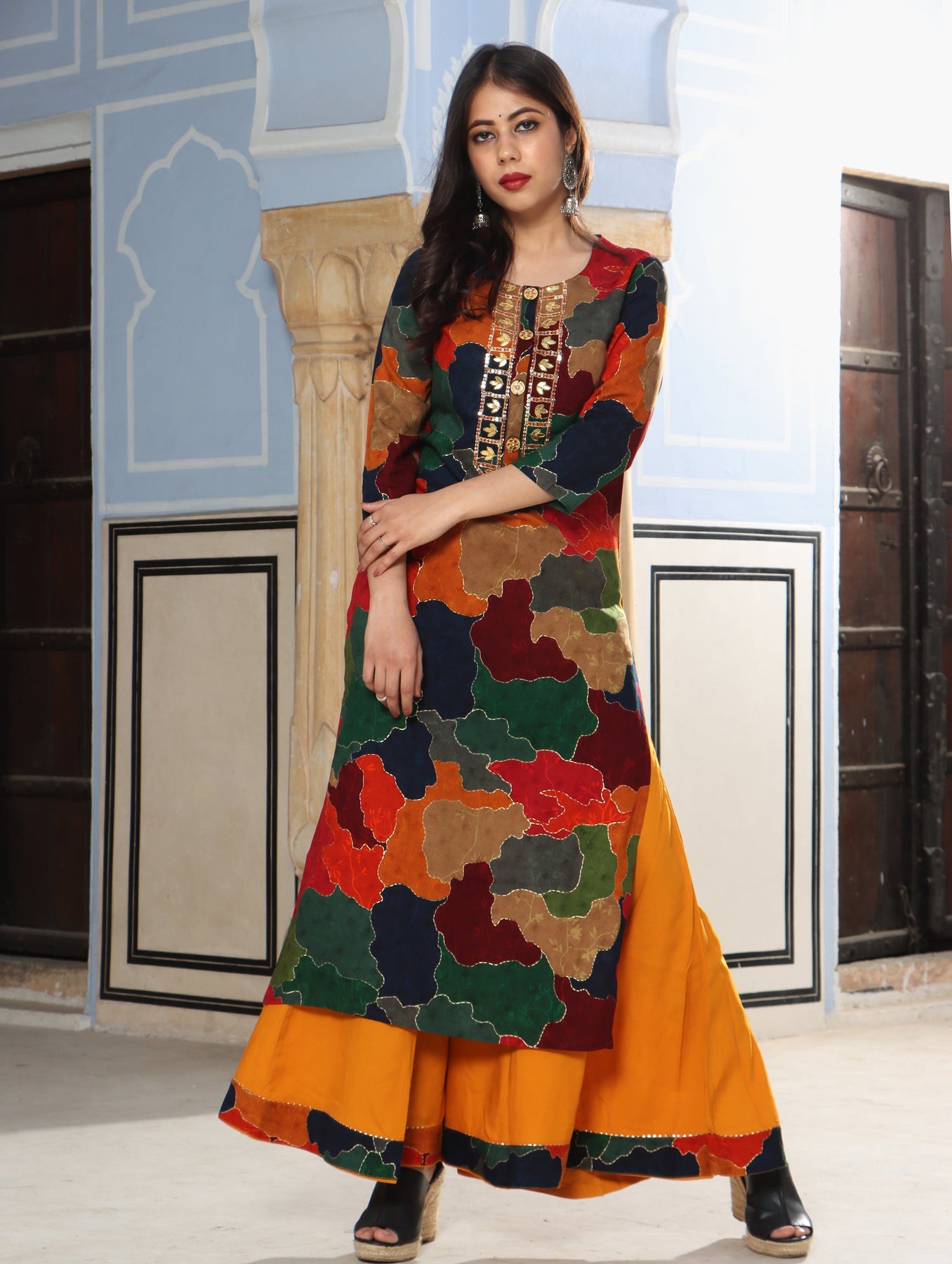 Add glitter to your ethnic look with this attractive straight kurta and palazzo set. This multicolored kurta paired with a yellow flared divider palazzo is made up of rayon fabric, giving you an ethnic look. The straight kurta has an abstract print embellished with Zari work and Gota Patti work along with designer buttons. Flared divider palazzo has a decorative lace border on the hem. Suit it up with a heels or traditional jutties, an excellent choice for any festive occasion.