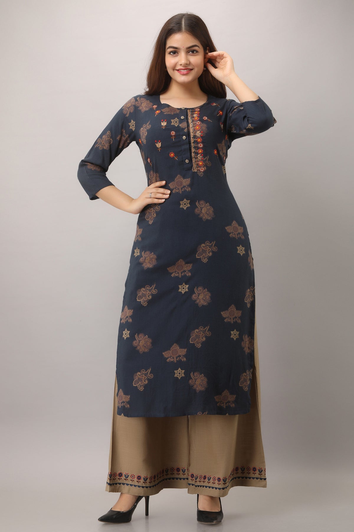 Navy Blue Color Rayon Slub Straight Womens Kurta with Palazzo