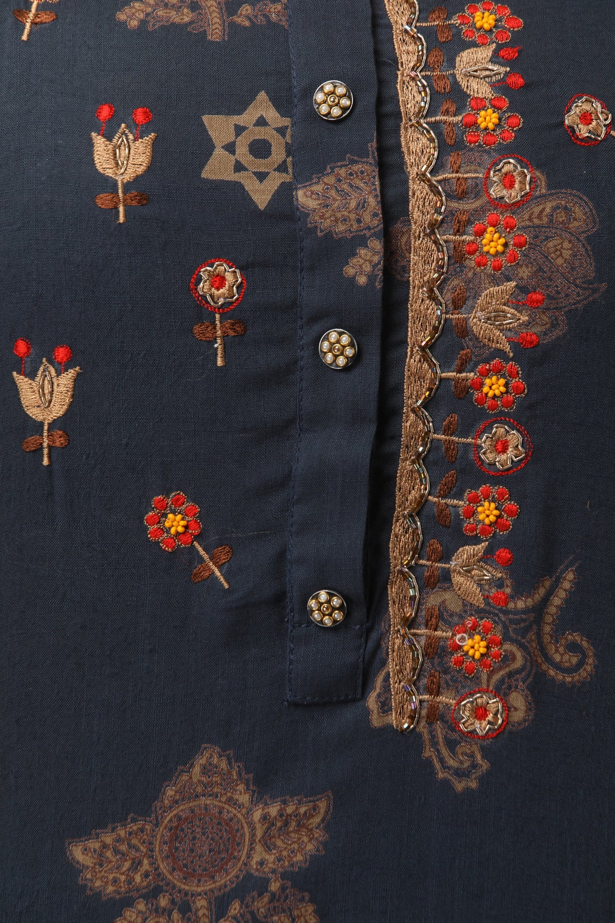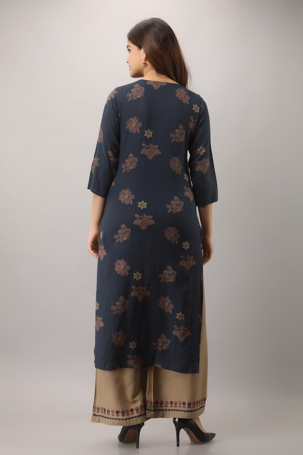 Add a beauty to your ethnic look with this stunning kurta and palazzo set. This dark blue-colored straight kurta paired with beige flared palazzo is made up of rayon fabric. The kurta has contemporary print embellished with Zari and Moti work. The flared palazzo has decorative border on the hem. Suit it up with mid-length heels or traditional jutties, a perfect choice for any festive occasion.