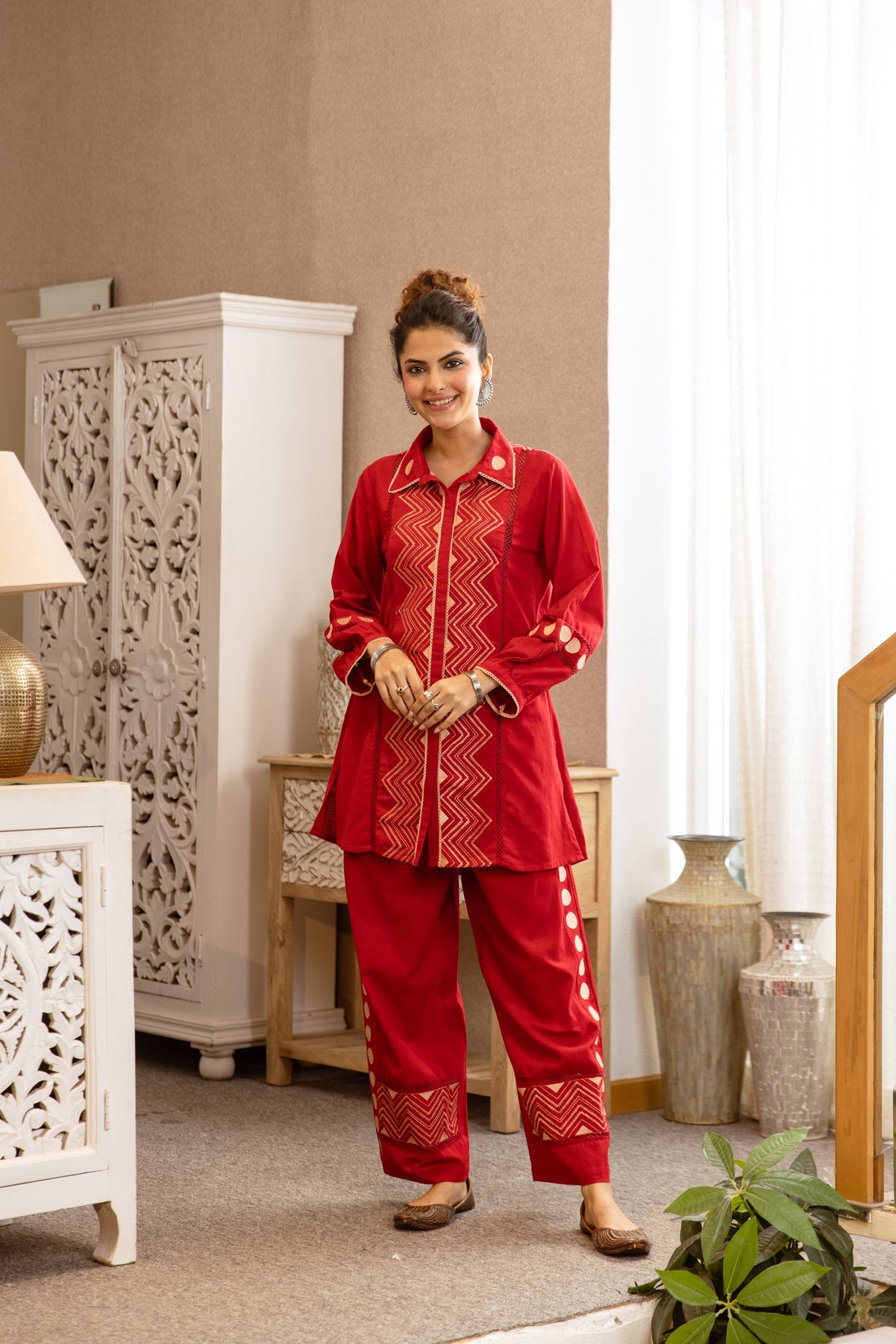 Nehamta Women’s Red Cotton Kurta & Pant Set. Crafted from soft, breathable cotton fabric, this set keeps you comfortable throughout the day while offering a timeless and graceful look. The bold red kurta, paired with matching pants, creates a flattering and easy-to-wear silhouette. Perfect for daily wear, office use, casual outings, or festive day events, this ensemble blends traditional charm with everyday comfort.