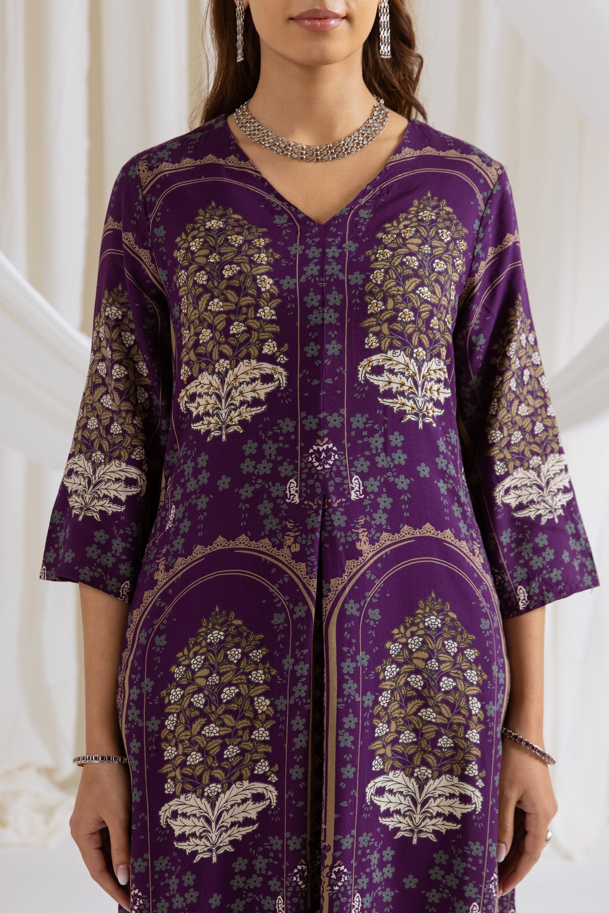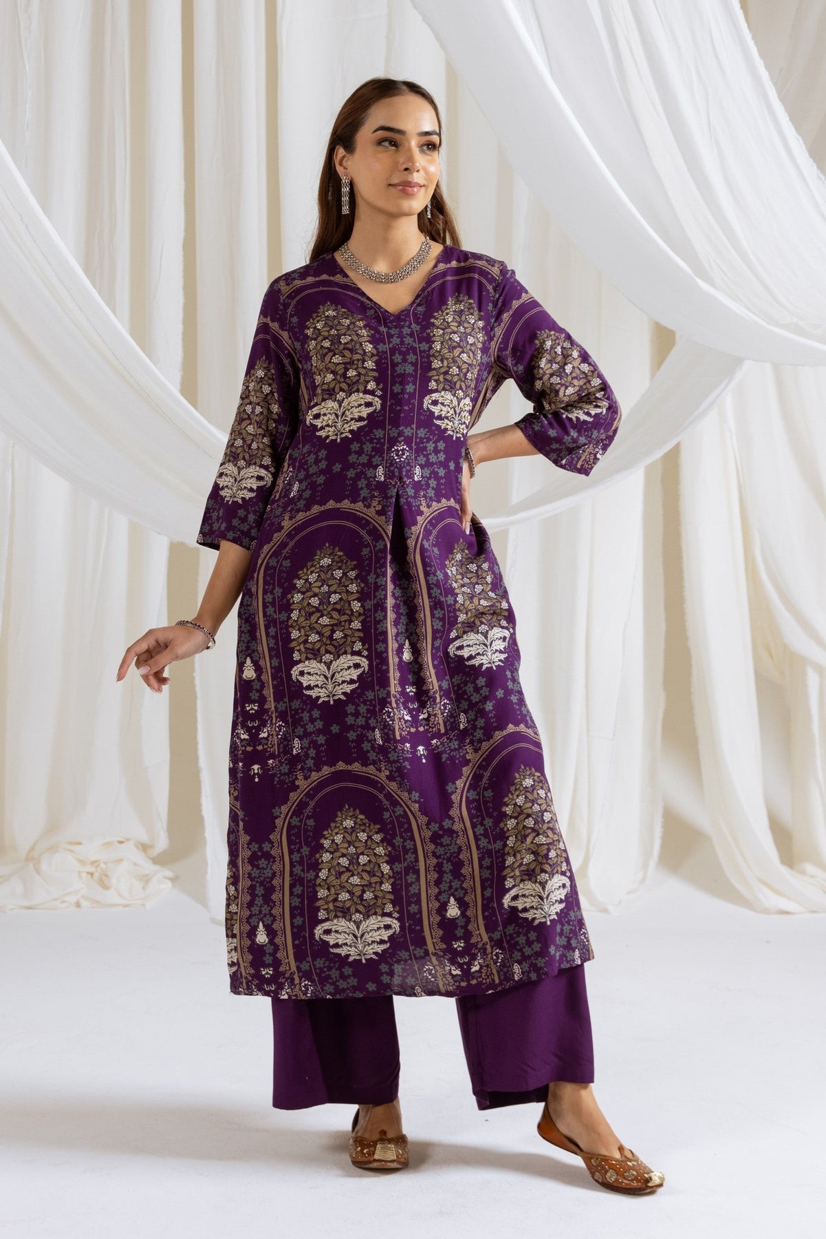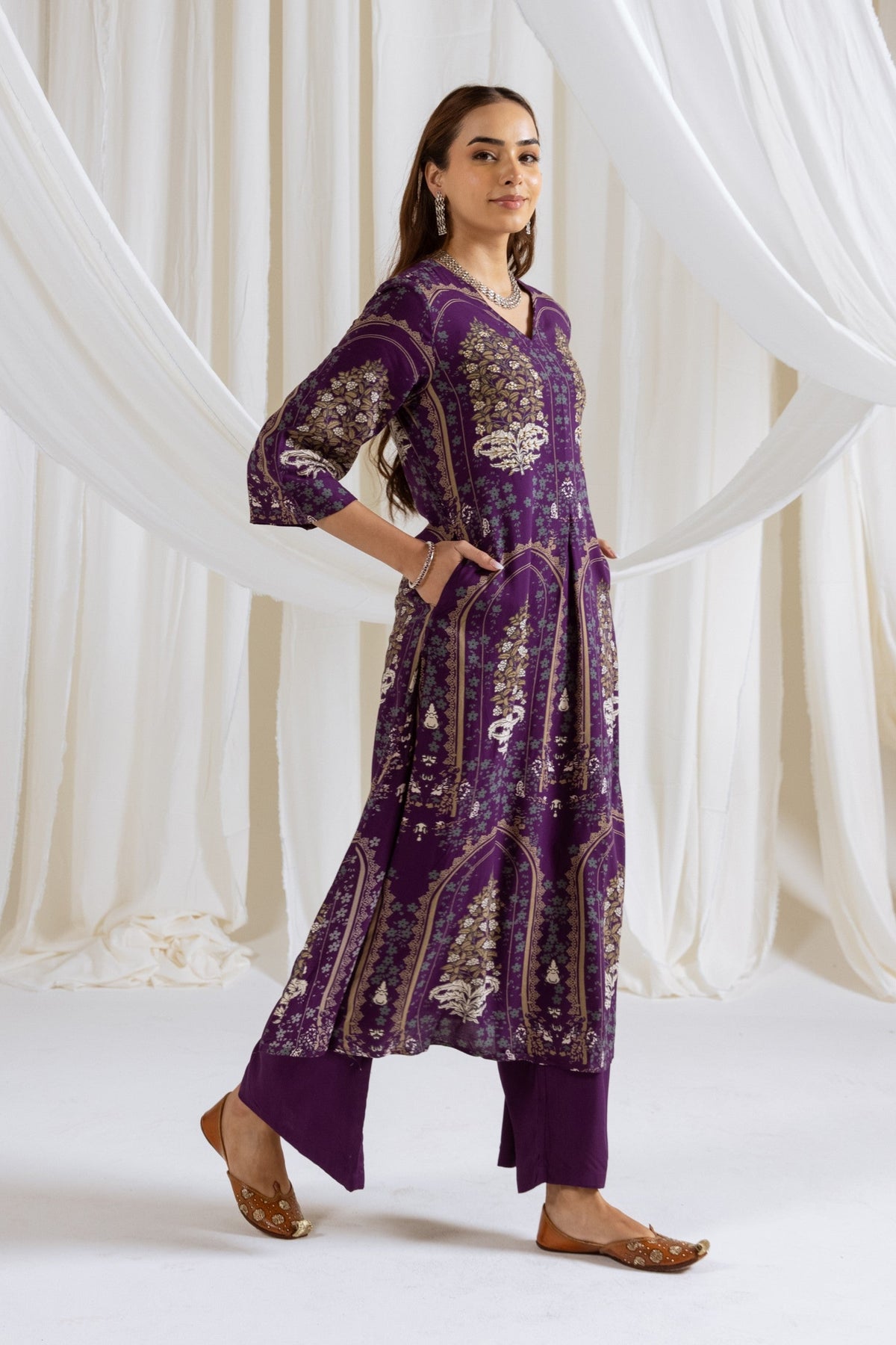 This Purple Kurta & Palazzo set is crafted from soft German Rayon, combining comfort with a stylish ethnic look. The kurta features intricate sequins and beads work over a floral print, with 3/4 sleeves and a flattering V-neck, adding elegance to the ensemble. It comes with a matching palazzo for a complete outfit. Perfect for festive occasions, casual gatherings, or family celebrations with effortless charm.