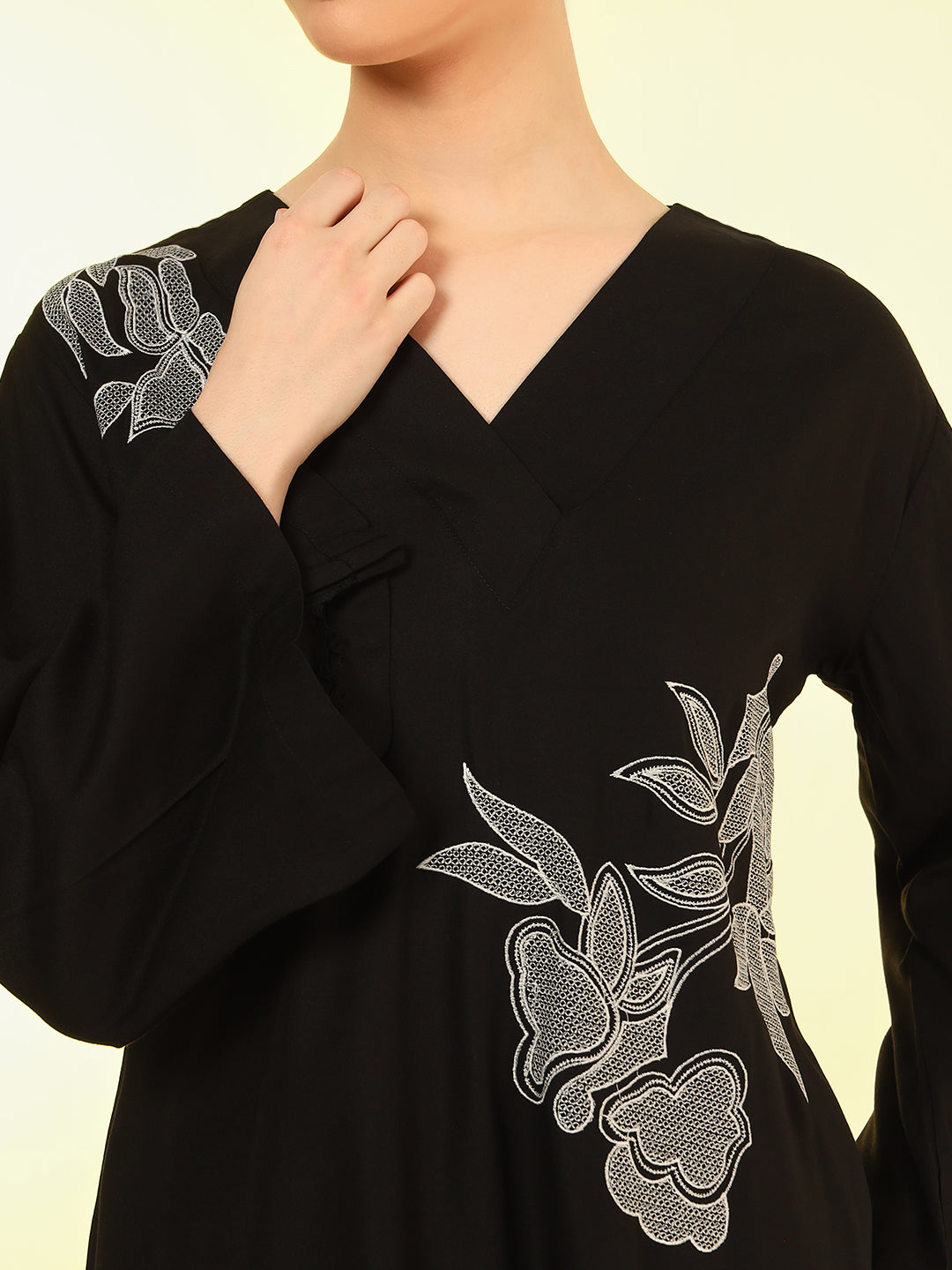 Elevate your style with this elegant black co-ord set featuring delicate white floral embroidery. The V-neck top and Palazzo offer a flattering, relaxed fit for all-day comfort. Perfect for casual outings or semi-formal events, it blends simplicity with subtle sophistication.
