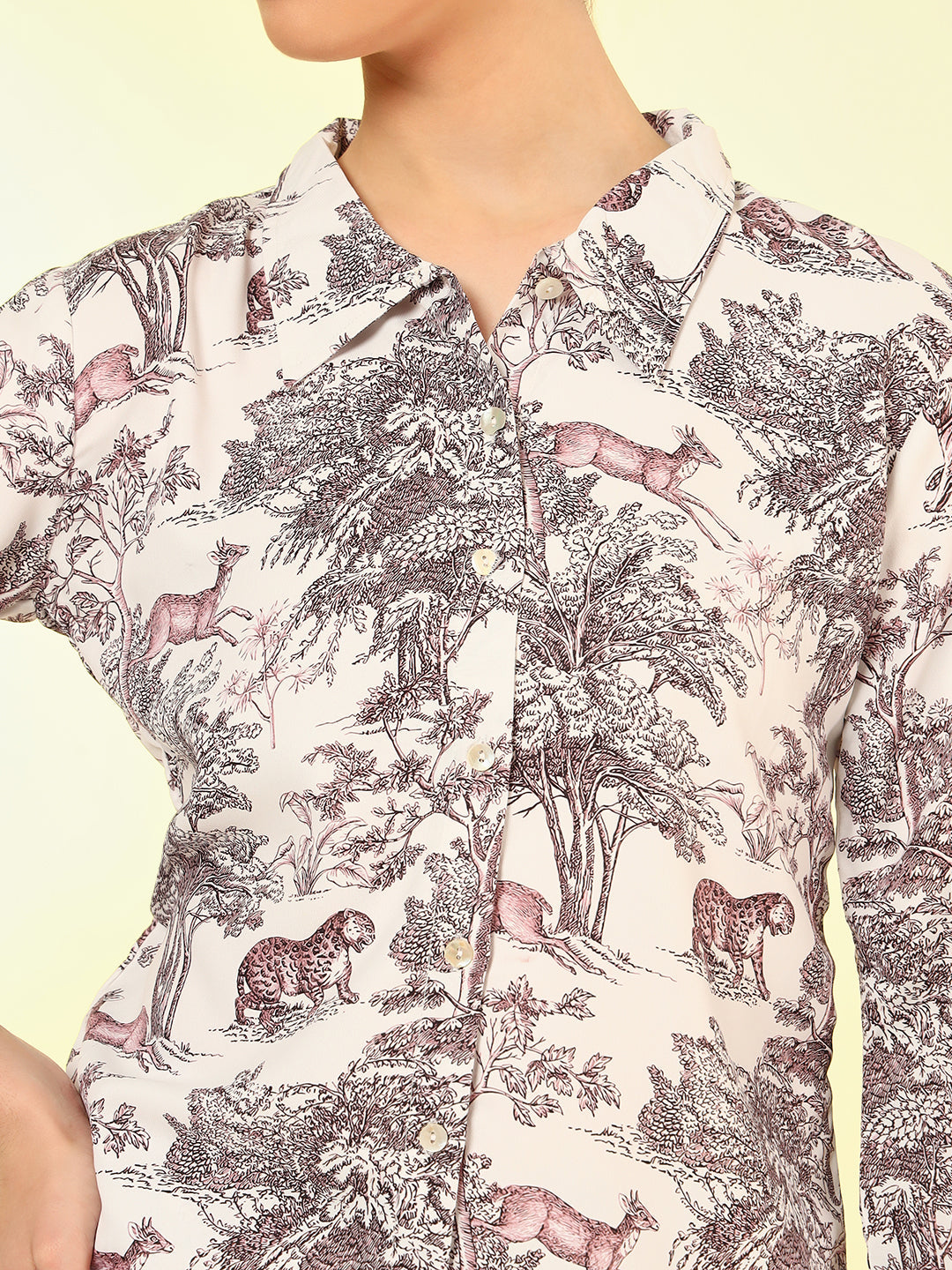 Step into effortless style with this white co-ord set featuring a unique wildlife and forest print. The soft fabric and relaxed fit make it perfect for lounging or casual outings. With its button-down shirt and palazzo, it blends comfort with a touch of artistic charm.