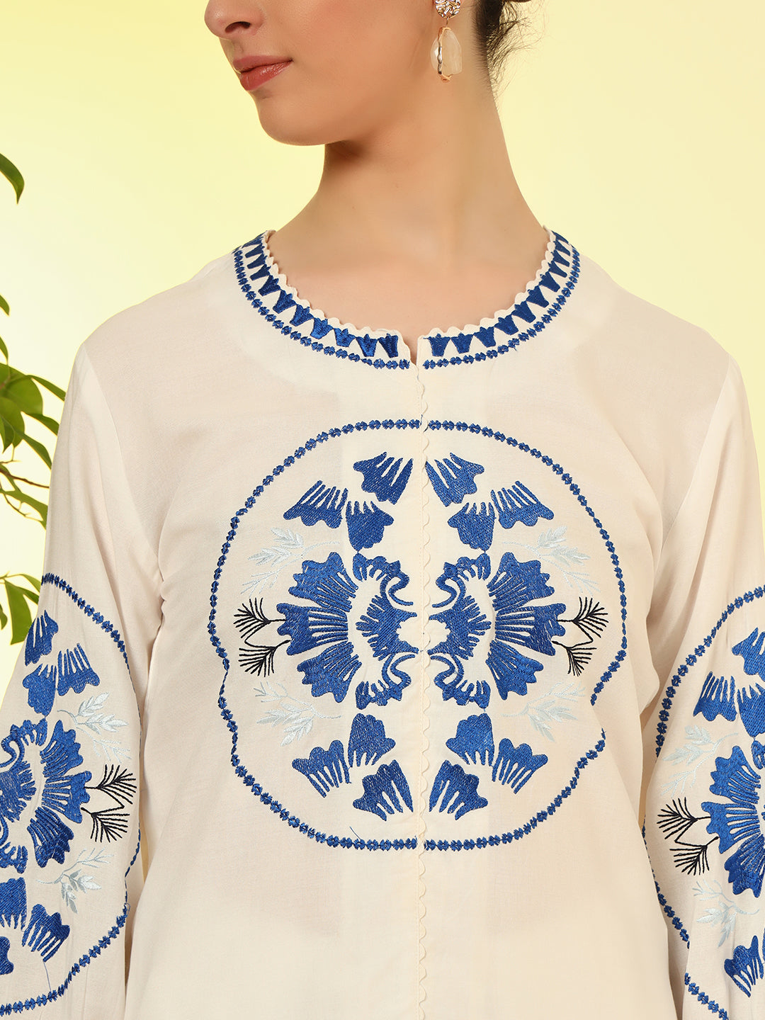 This elegant white co-ord set features striking royal blue floral embroidery on the front and sleeves, adding a bold yet graceful touch. The kurta has a round neckline with delicate scalloped detailing and a comfortable straight-fit silhouette. Paired with simple white palazzo, it's a perfect blend of tradition and modern minimalism.