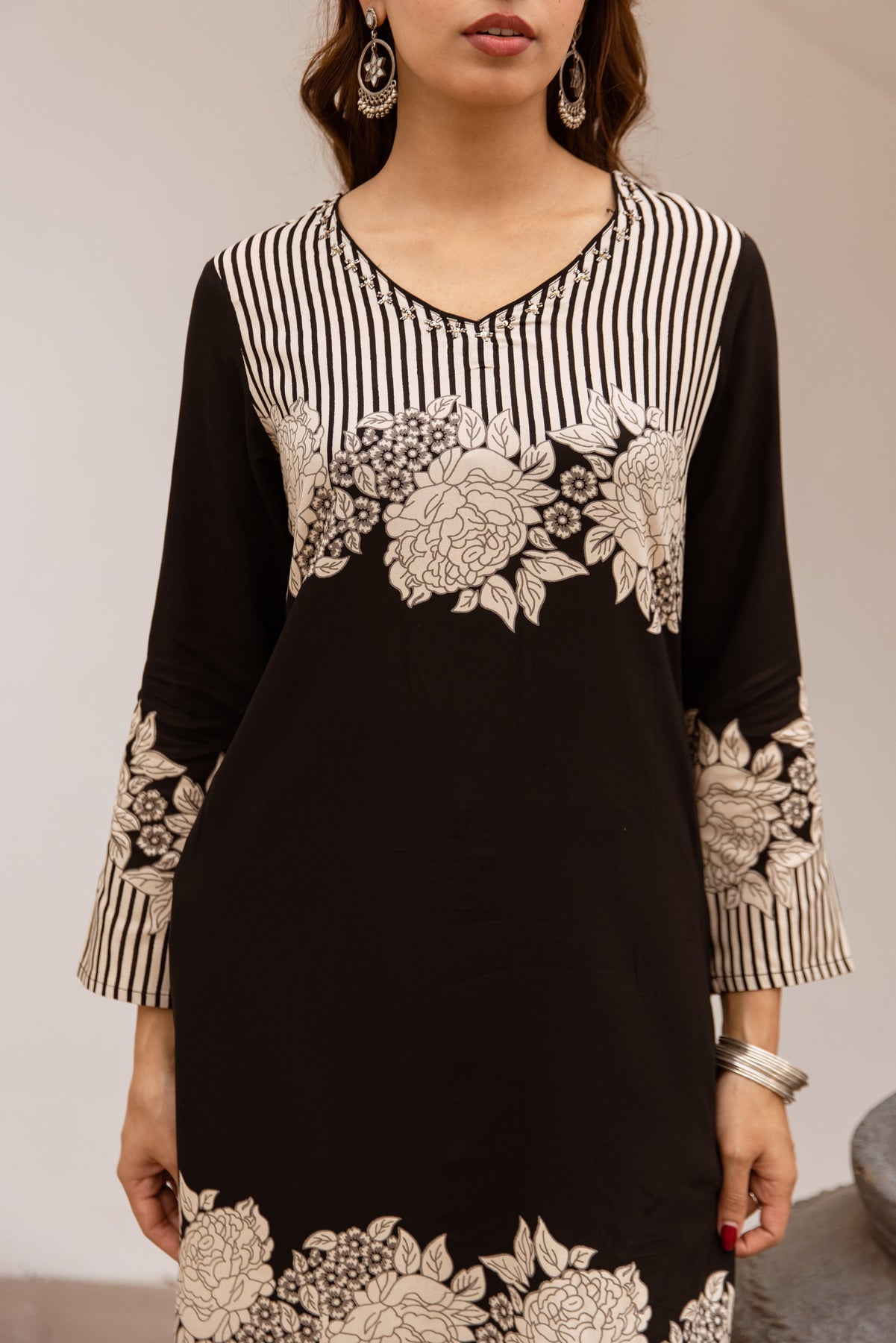 Black and off-white straight kurta with floral and striped print, paired with matching palazzo pants.