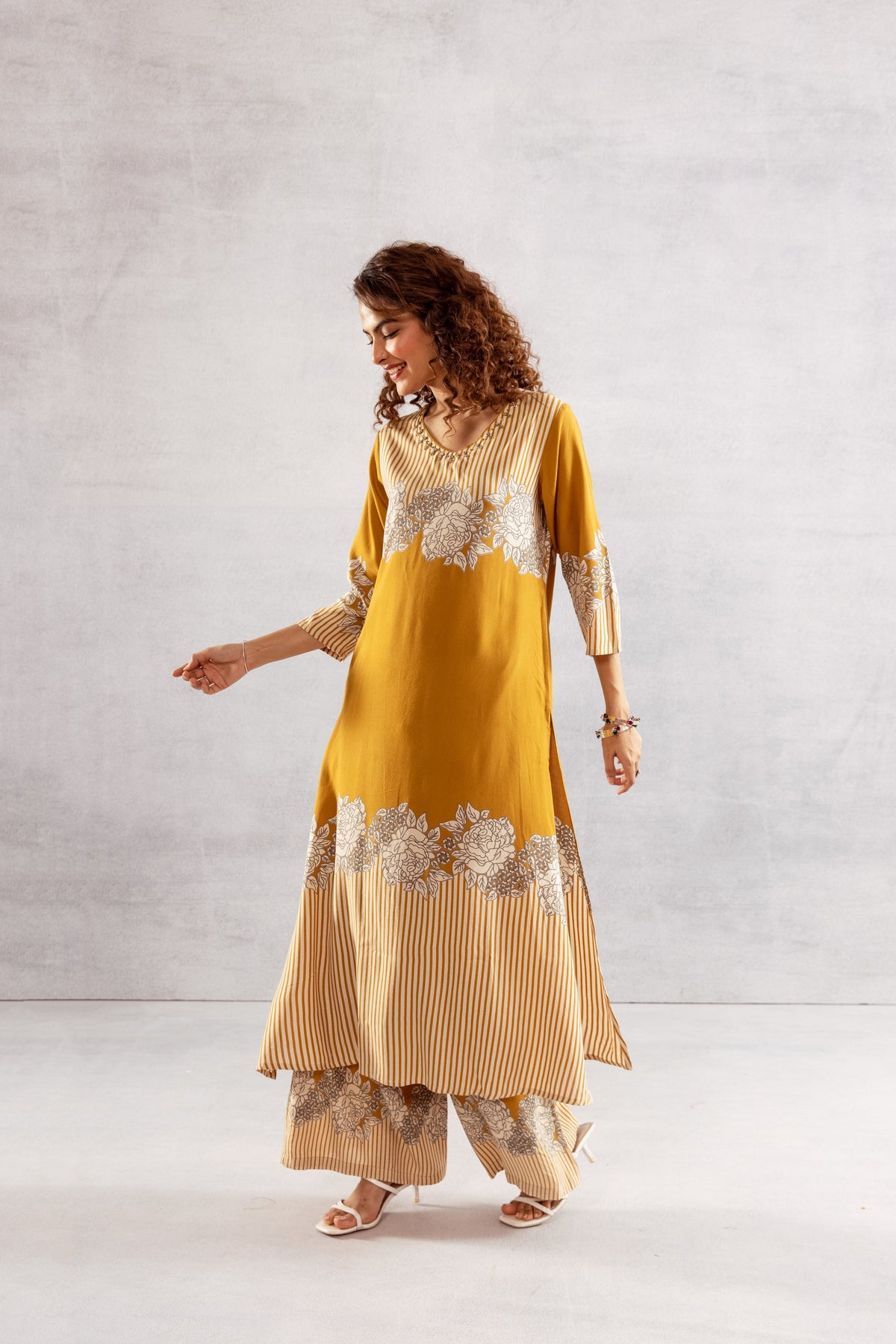Mustard yellow kurta set featuring a mix of floral and striped prints, paired with matching palazzo pants.