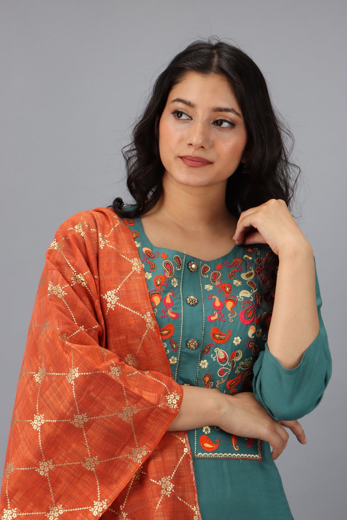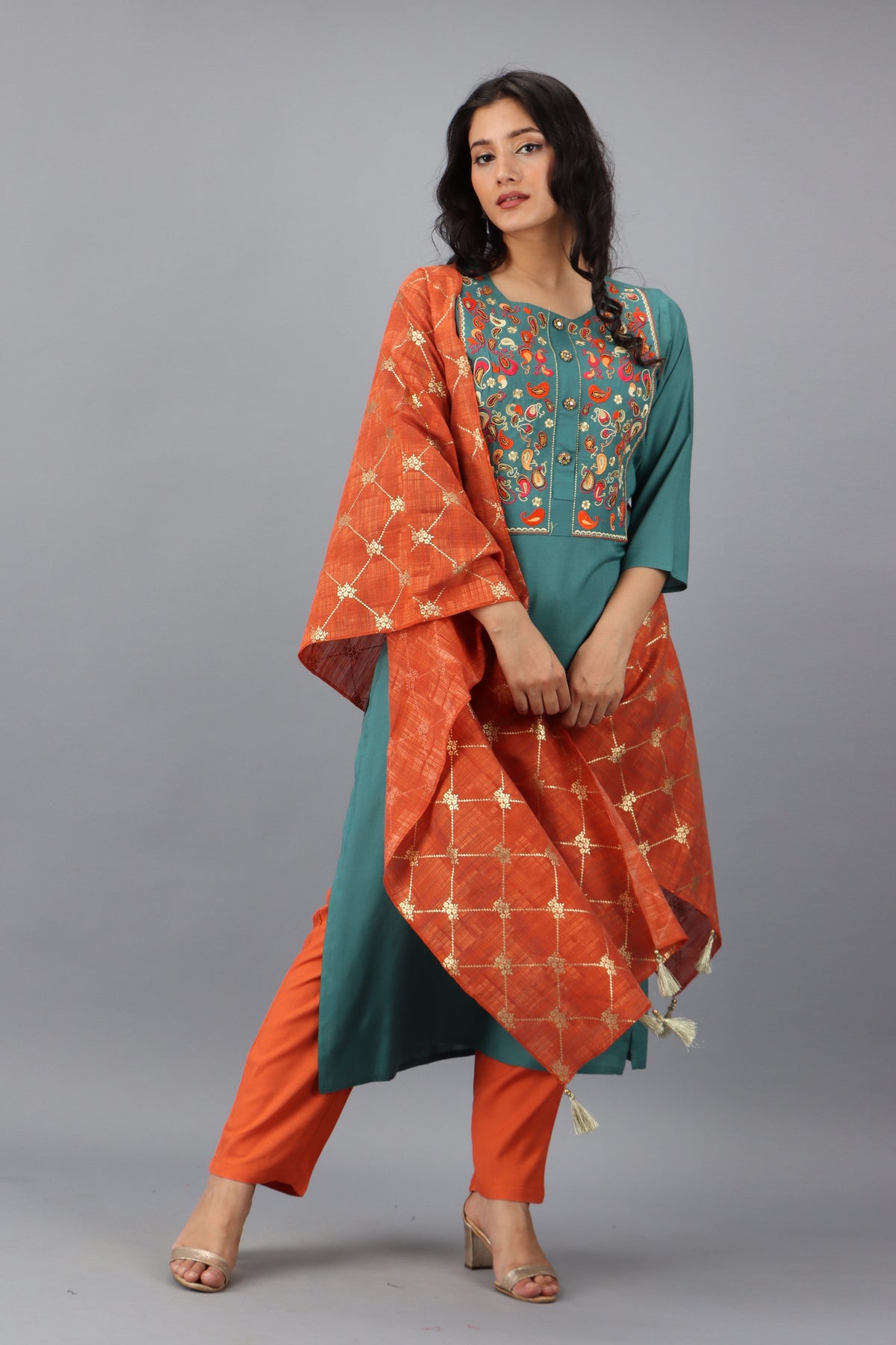 Enhance your ethnic look with this straight Kurti, pants, and dupatta set. This turquoise-colored Kurti paired with orange straight pants is made up of synthetic rayon fabric. And the orange-colored dupatta is made up of cotton fabric. The Kurti has a hand-embellishment of Kantha, Zari, and beads work along with designer buttons on the placket. The dupatta has checkered floral foil print all over. Style it with block heels or ethnic flats. Excellent choice for any festive or party occasion.