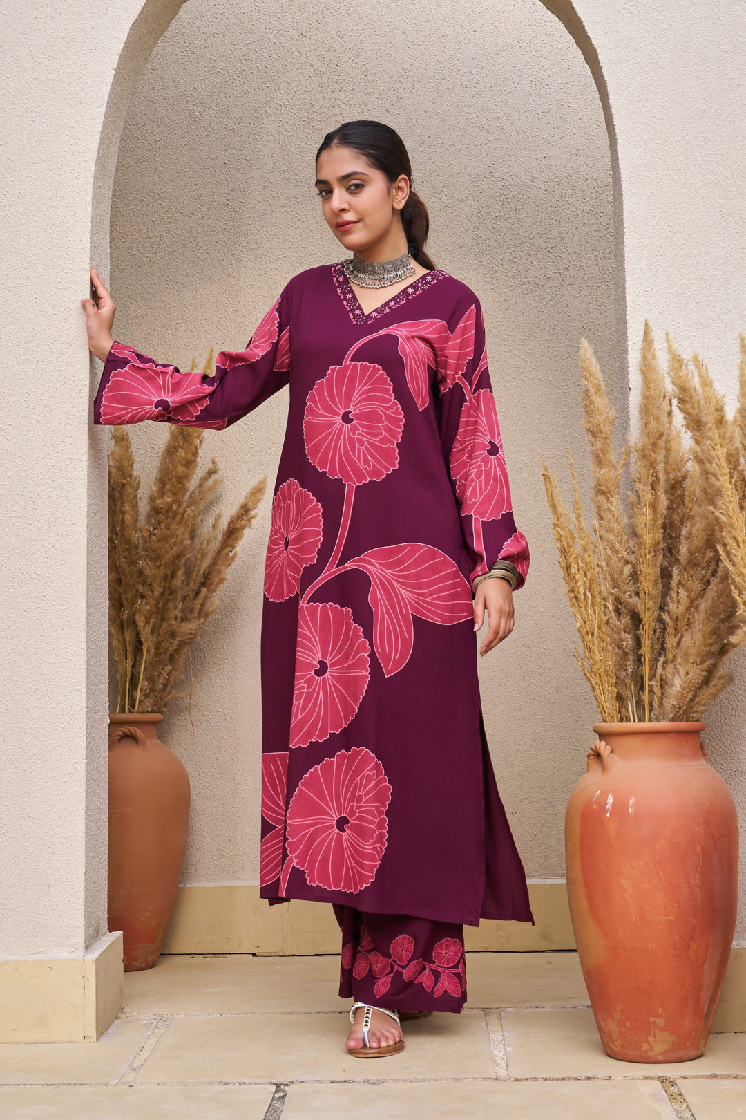 Nehamta Women's Wine German Rayon Kurta & Palazzo Set