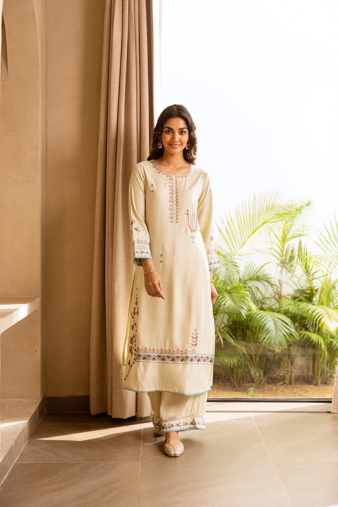 Nehamta Women's Cream German Rayon Kurta & Palazzo Set