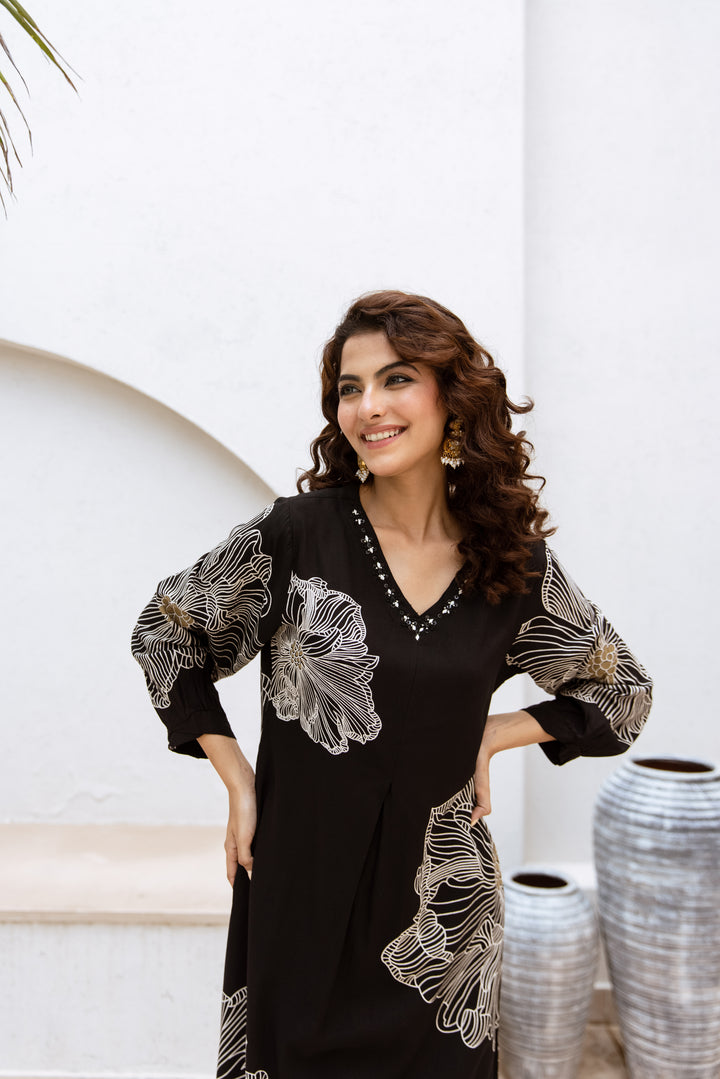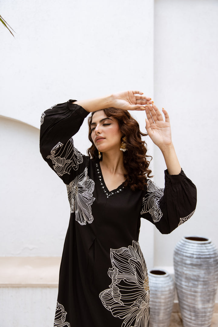 Step into elegance with this soothing Black kurti set, designed for women who love subtle sophistication. Made from soft, breathable fabric, the kurti features delicate prints that offer a refreshing appeal, perfect for summer and day events. The straight-cut silhouette adds a graceful fall, while the coordinated pants complete the ethnic look effortlessly. Style this set with light silver jewelry and flats for casual outings, office wear, or intimate festive moments.