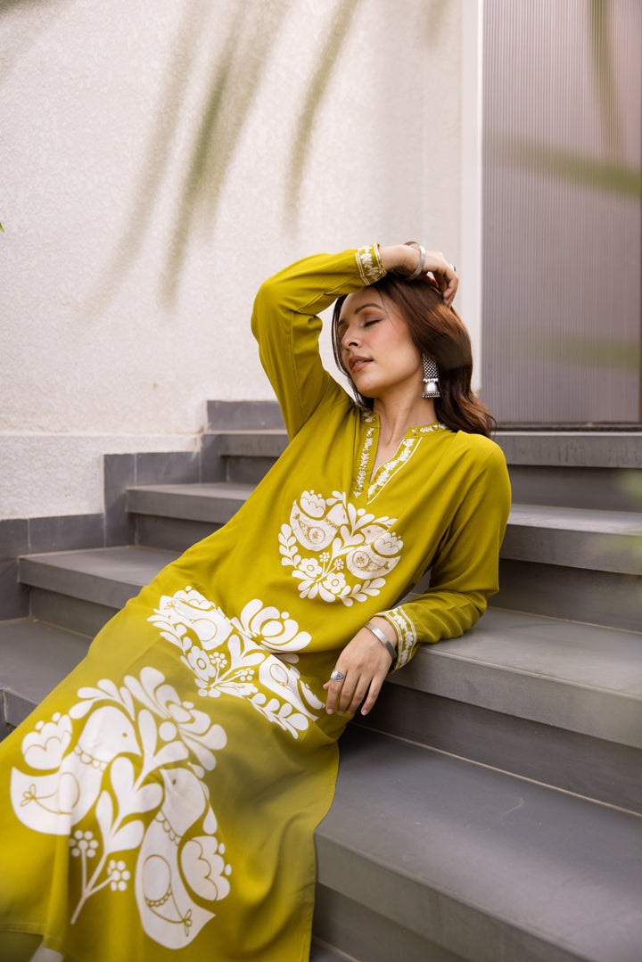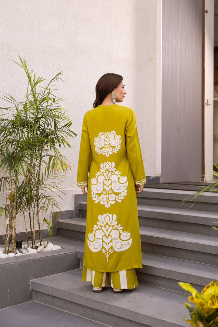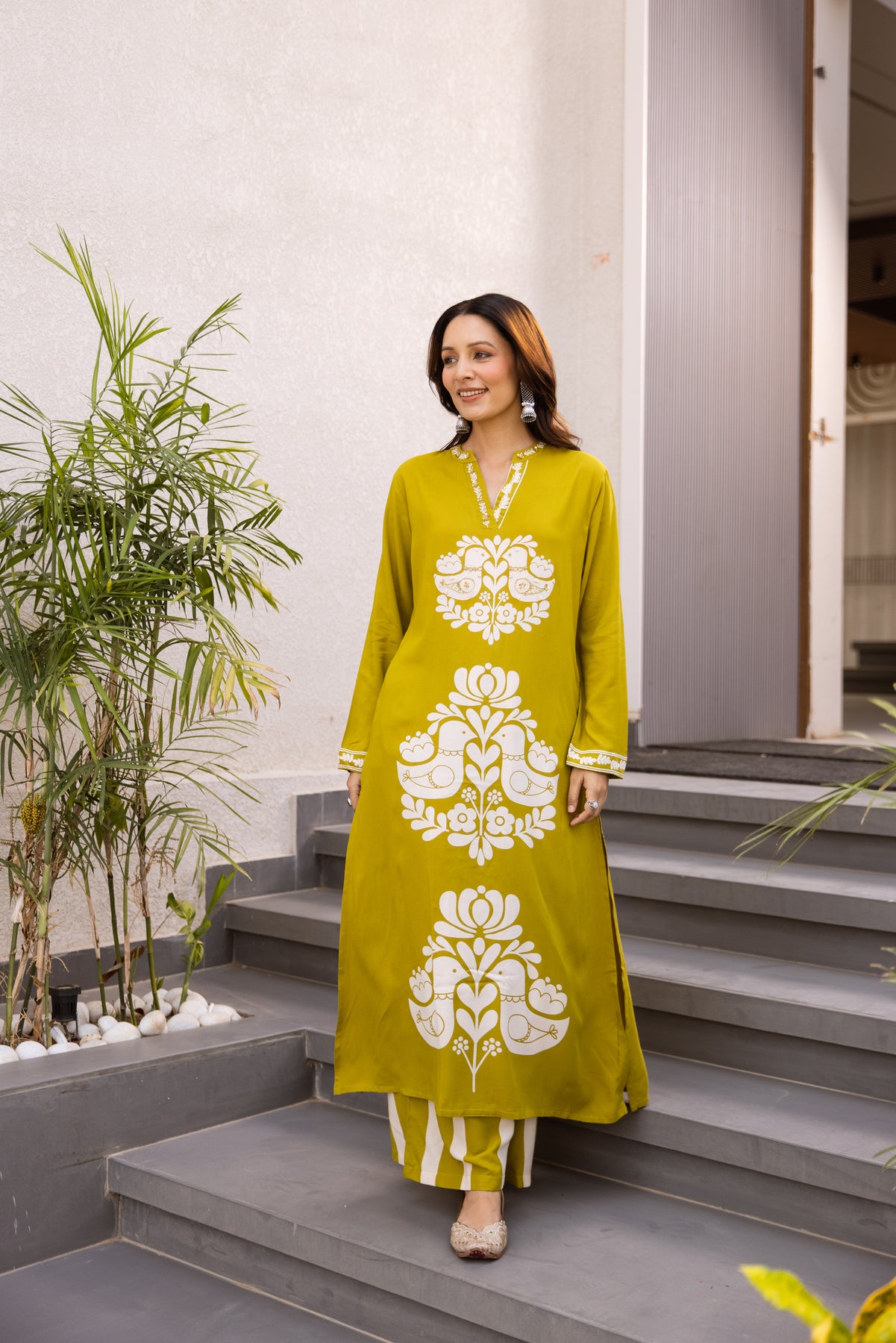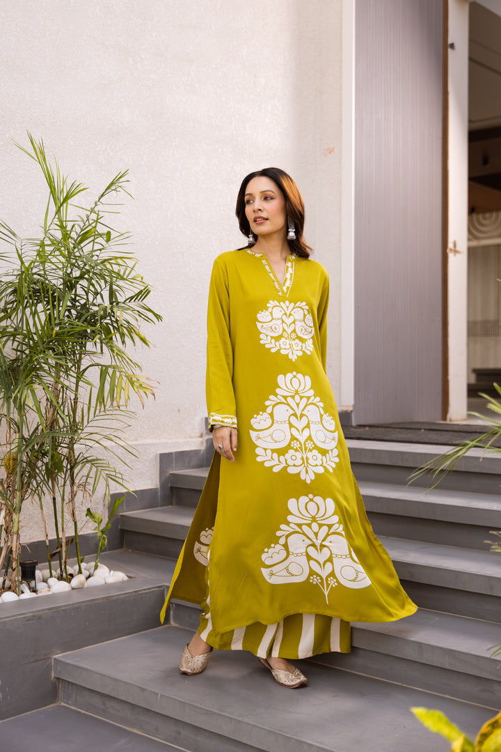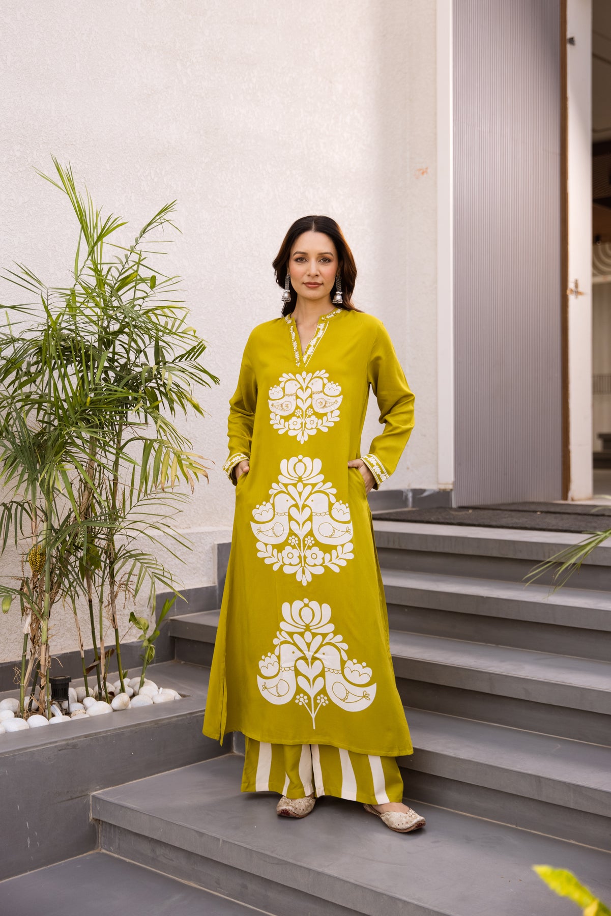 Step into effortless elegance with this vibrant olive green kurta set, featuring intricate white floral block prints that exude a blend of tradition and modern flair. Crafted in a flowy silhouette with full sleeves and a comfortable fit, the kurta is perfectly paired with striped palazzo for a chic contrast. Ideal for festive gatherings, casual outings, or daytime celebrations, this ensemble brings together comfort and style with a touch of ethnic sophistication.