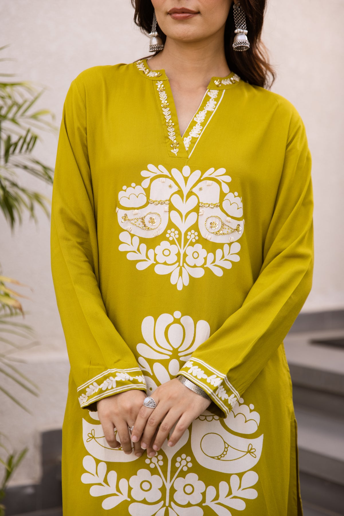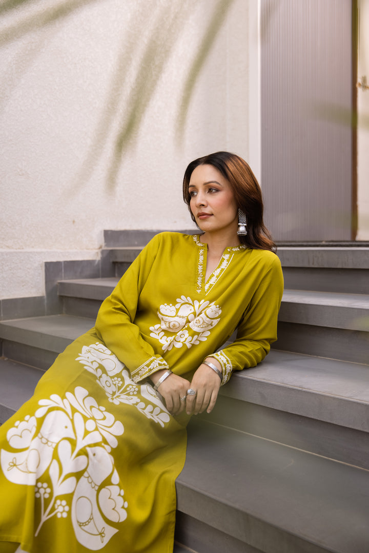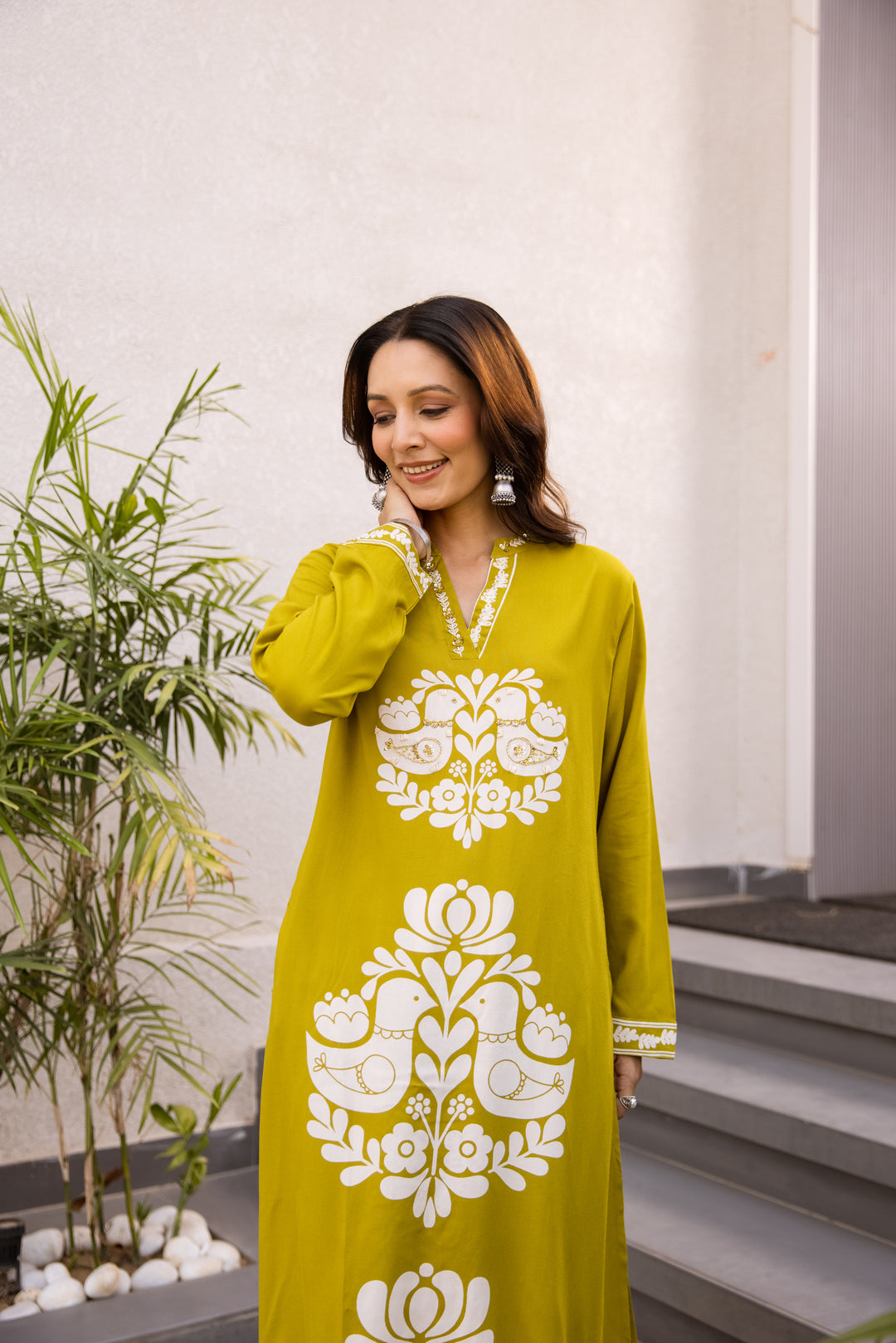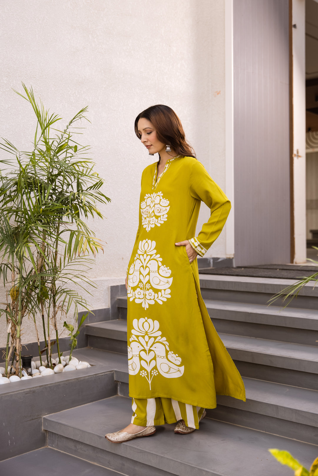 Step into effortless elegance with this vibrant olive green kurta set, featuring intricate white floral block prints that exude a blend of tradition and modern flair. Crafted in a flowy silhouette with full sleeves and a comfortable fit, the kurta is perfectly paired with striped palazzo for a chic contrast. Ideal for festive gatherings, casual outings, or daytime celebrations, this ensemble brings together comfort and style with a touch of ethnic sophistication.