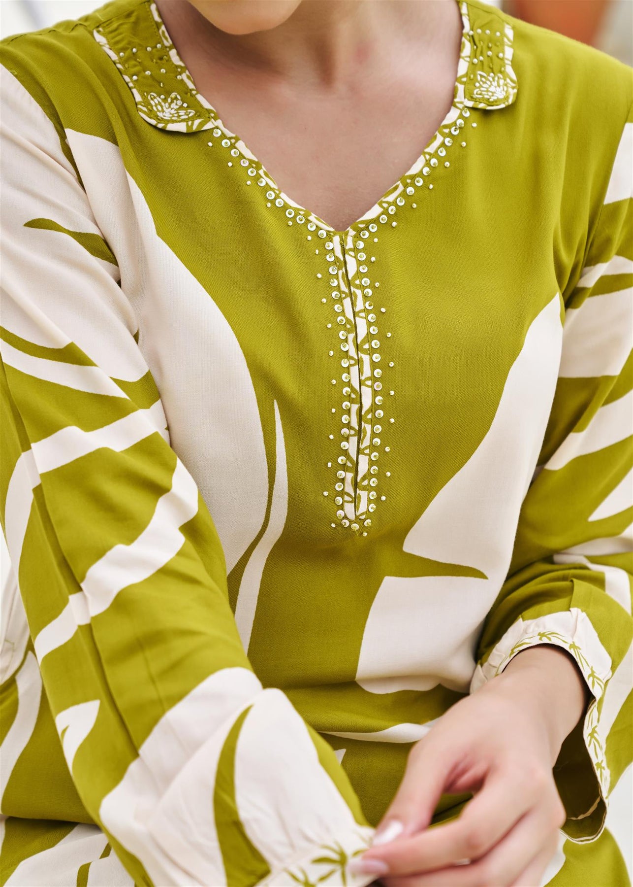 This outfit is made from German Rayon fabric, known for its smooth texture and breathability. The rich olive green color is beautifully paired with contrasting white floral patterns, creating an elegant and modern look. The delicate embroidery along the neckline and sleeve cuffs adds a touch of refinement, making it a perfect choice for casual or semi-formal occasions.