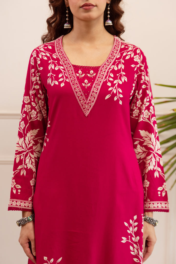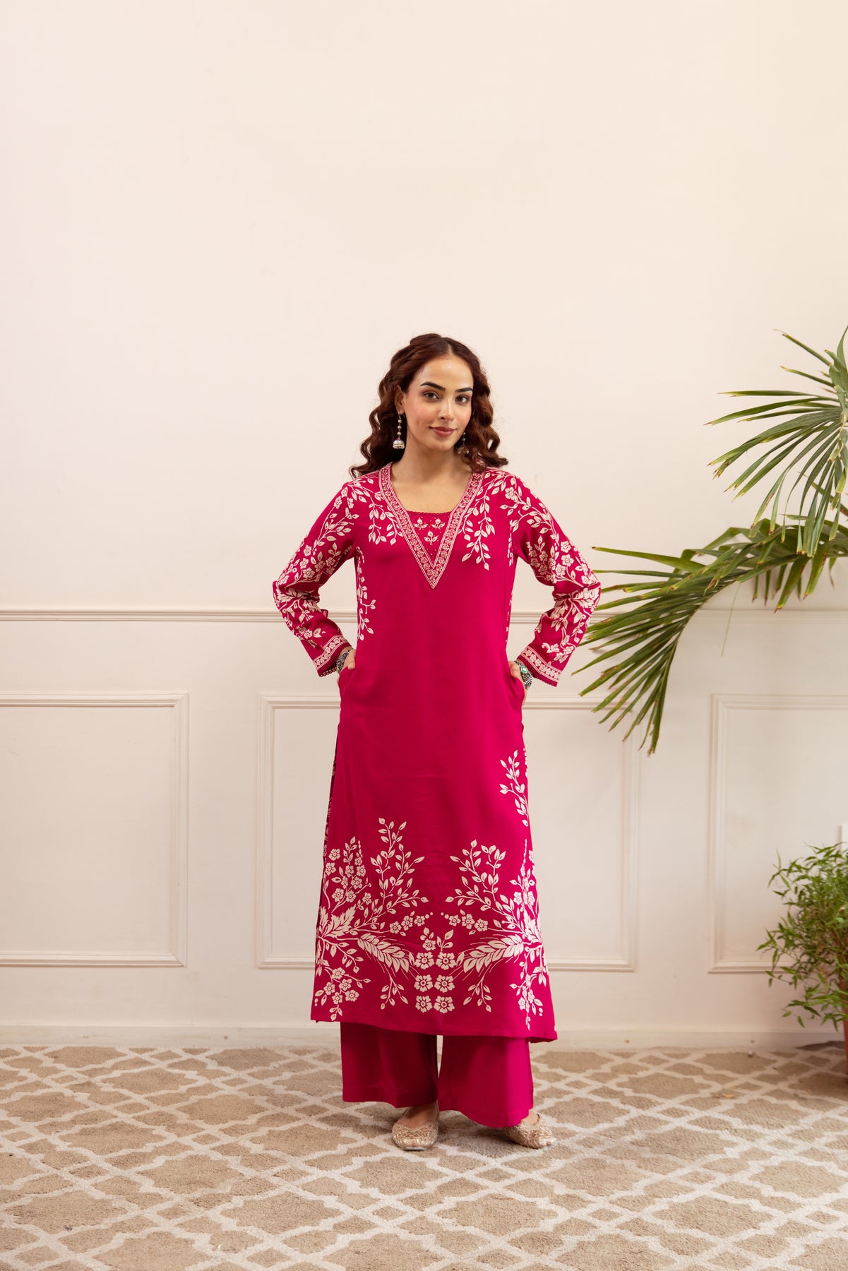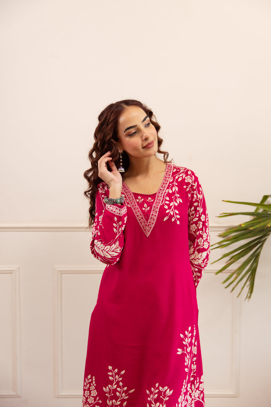 Add a touch of elegance to your everyday wardrobe with this beautifully crafted pink rayon kurta set. Designed for comfort and style, the kurta features intricate floral print work that gracefully adorns the neckline, sleeves, and hem. The V-shaped neckline is enhanced with delicate printed detailing, adding a refined charm to the overall look. Paired with matching wide-leg bottoms, this ensemble is perfect for festive occasions, casual outings, or family gatherings.