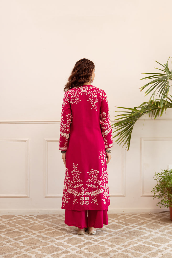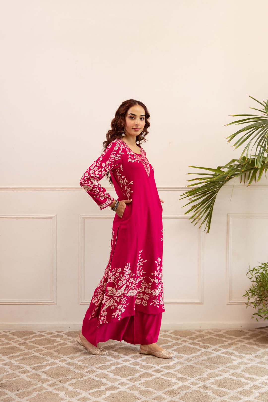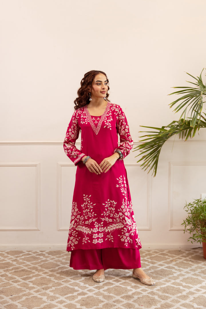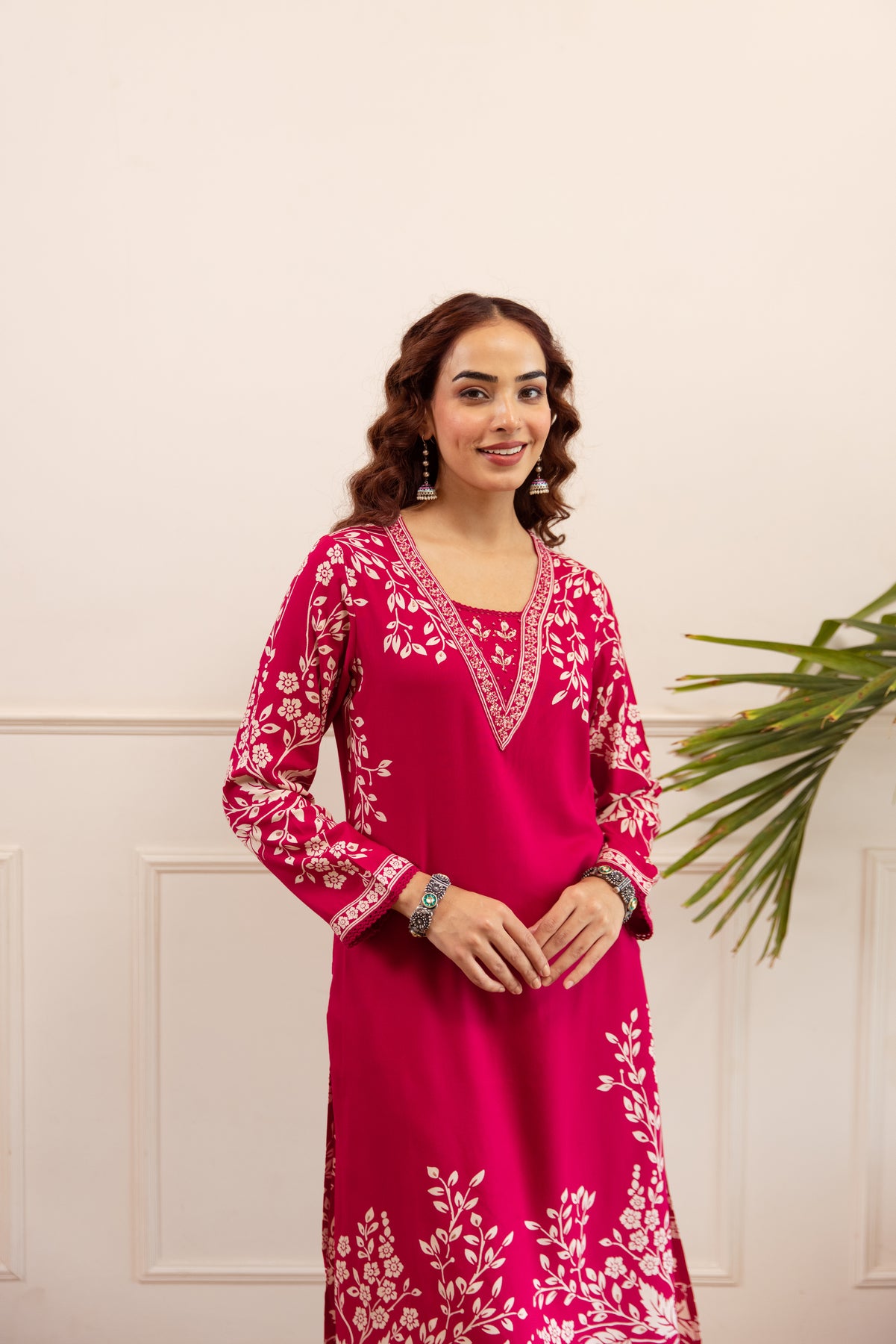 Add a touch of elegance to your everyday wardrobe with this beautifully crafted pink rayon kurta set. Designed for comfort and style, the kurta features intricate floral print work that gracefully adorns the neckline, sleeves, and hem. The V-shaped neckline is enhanced with delicate printed detailing, adding a refined charm to the overall look. Paired with matching wide-leg bottoms, this ensemble is perfect for festive occasions, casual outings, or family gatherings.