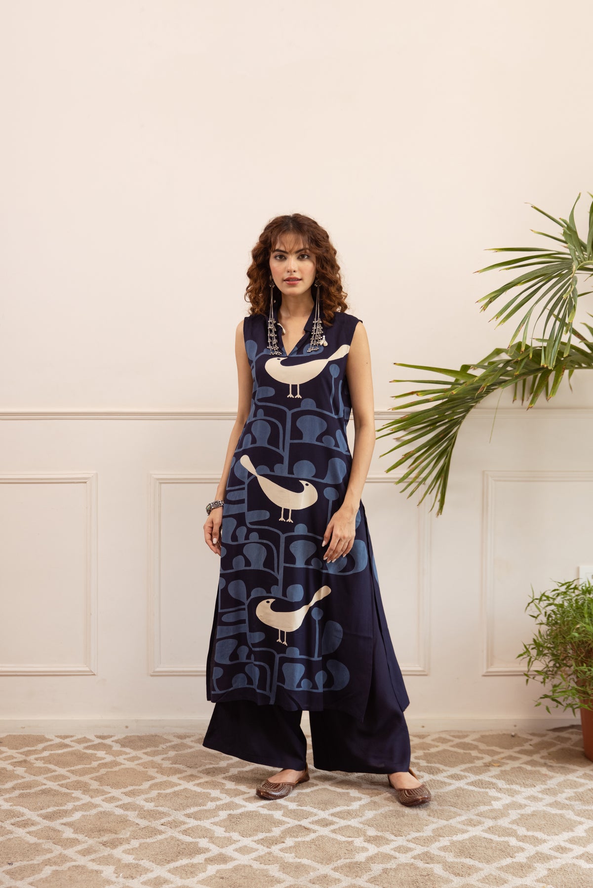 Nehamta Women's Navy Blue Cotton Kurta & Palazzo Set