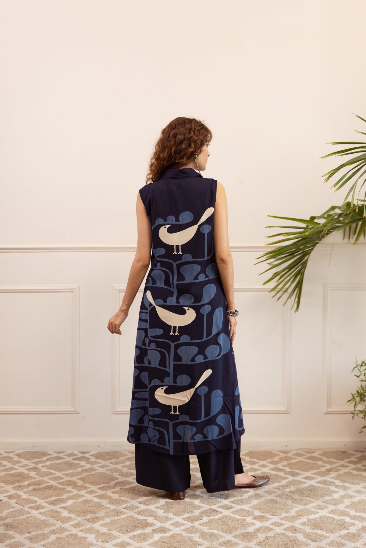 It features a sleeveless design with a quirky bird print in a soothing contrast.